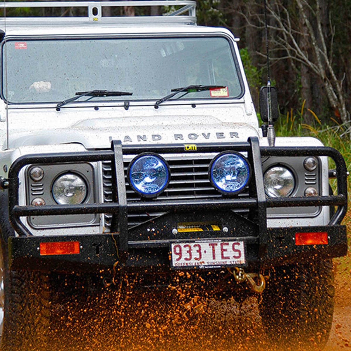 The TJM Multi-fit winch bumper offers exceptional frontal protection for your Defender. Our engineers have spent countless hours perfecting the design of these bars to ensure our customers are equipped with one of the finest products in the market. Full wrap cato straps and 50mm outer pipework provides added strength, damage deflection and headlight protection. This TJM Multi-fit heavy duty bumper is 4x4 equipped with a built in steel winch-mount suitable for high and low mount style electric winches, with indicator lights. It's ready for your overlanding adventures with dual aerial mounts and mounting points for installing large single bolt driving lights.