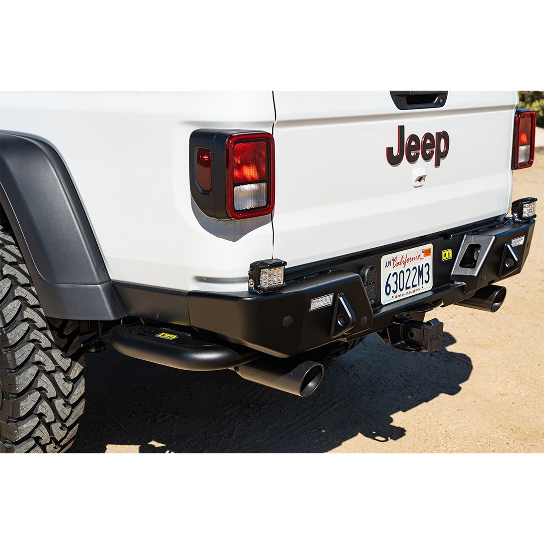 TJM’s Rear Protection Bumper for your Jeep Gladiator offers excellent rear protection whilst offering a step to jump into the bed of your truck. Manufactured from strong steel material and chassis-mounted for maximum strength this rear Bumper allows for the fitment of optional TJM LED Rock Lights for nighttime navigation and comes standard with built-in D-Ring points to ensure you are 4x4 Equipped with the best. Finished in a matt black textured powder coat for a durable low maintenance finish as well as being designed to follow the unique lines of your Gladiator and provide the maximum available departure angle for your next overlanding adventure.